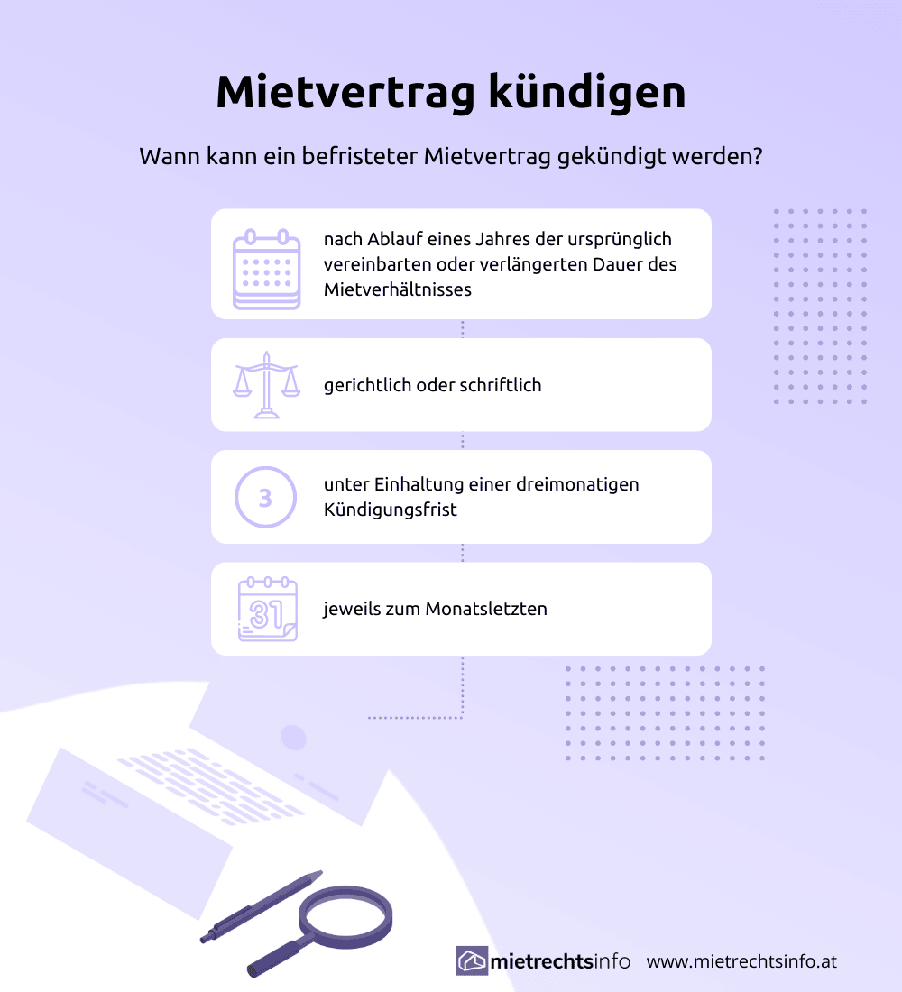Bei befristeten Mietverträgen muss man zum einen unterscheiden, ob auf das Mietobjekt Das Mietrechtsgesetz voll, teilweise oder gar nicht anwendbar ist. Wenn das Mietrechtsgesetz voll oder teilweise auf den Mietvertrag des zu kündigenden Mietobjektes anwendbar ist, ist eine Kündigung erst nach einem Jahr möglich. Die Frist der Kündigung beträgt in diesem Fall 3 Monate jeweils zum Monatsende.