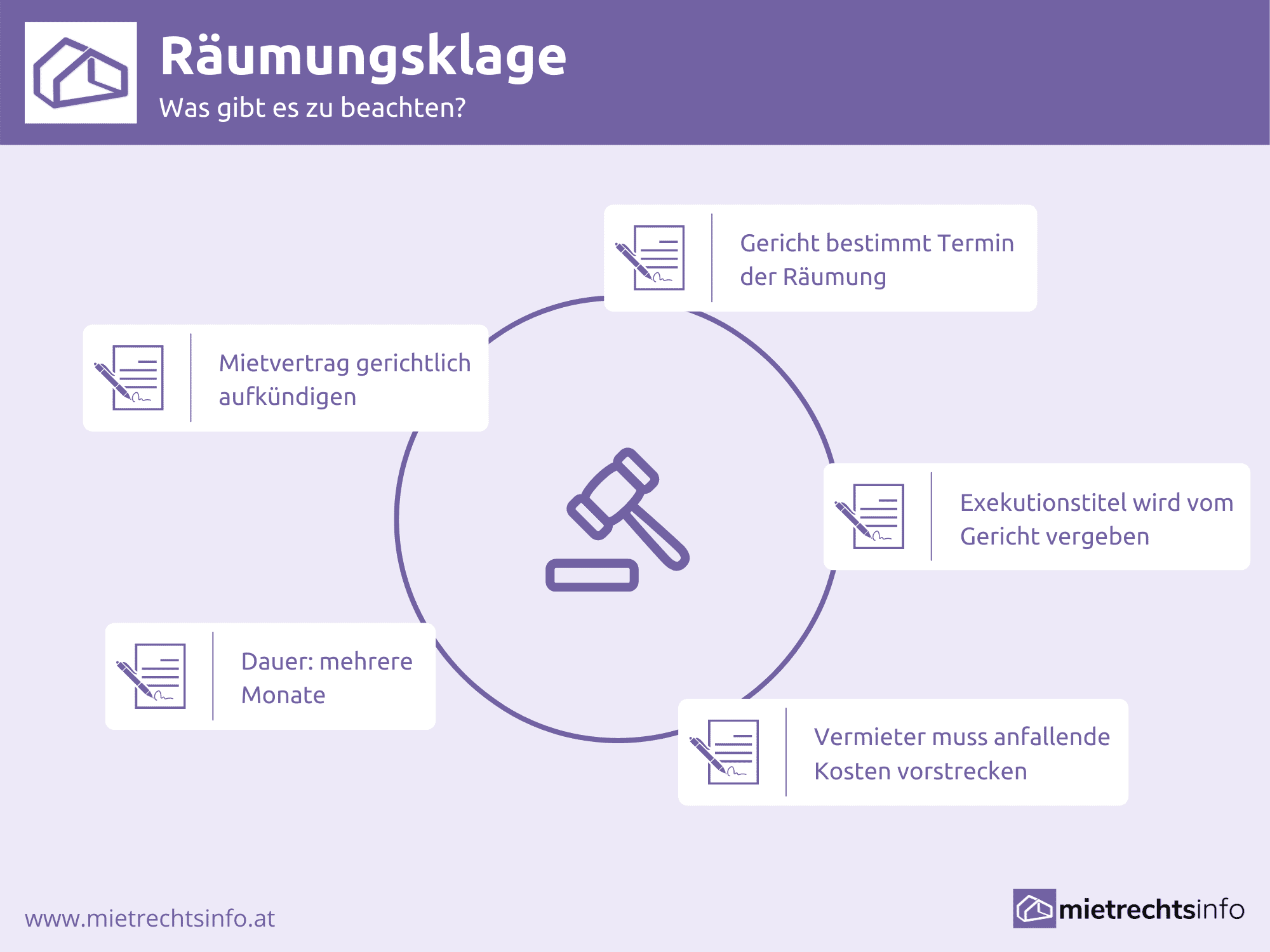 Zumeist vergehen von einer gerichtlichen Kündigung des Mieters bis zum endgültigen Räumungstermin oder einer evtl. Zwangsräumung immer mehrere Monate. Wurde die gerichtliche Kündigung bestätigt, muss der Vermieter auch eine Frist von vier Wochen eingehalten, bevor er einen Antrag auf Exekution stellen kann. Danach wird die Exekutionsbewilligung dem Mieter durch das Gericht zugestellt und dieser hat wiederum vier Wochen Zeit, um sein Einspruchsrecht wahrzunehmen. Erst danach kann der Räumungstermin oder eine evtl. Zwangsräumung ausgeschrieben werden.
