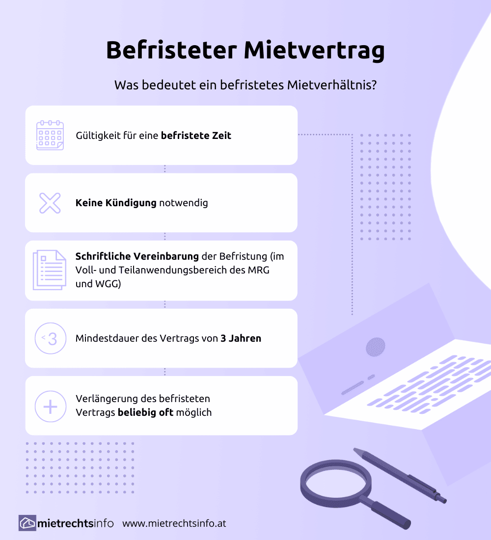 Hierbei kann dann im ersten Mietvertrag bereits vereinbart werden, dass ein Mieter unter der Voraussetzung von bestimmten Vorgaben (wie z. B. eine pünktliche Zahlung der Miete) ein Recht auf Ausdehnung der Dauer ausüben kann. Dabei muss dann diese immer auch wieder mindestens drei Jahre betragen. In der Praxis wird oft erst kurz vor der Beendigung der Frist eine Ausdehnung vereinbart oder entsprechend, ein neuer Vertrag geschlossen. Dabei muss diese im Voll- und Teilanwendungsbereich des MRG 3 Jahre betragen, kann natürlich aber für einen längeren Zeitraum vereinbart werden oder es wird ein unbefristeter Vertrag geschlossen.